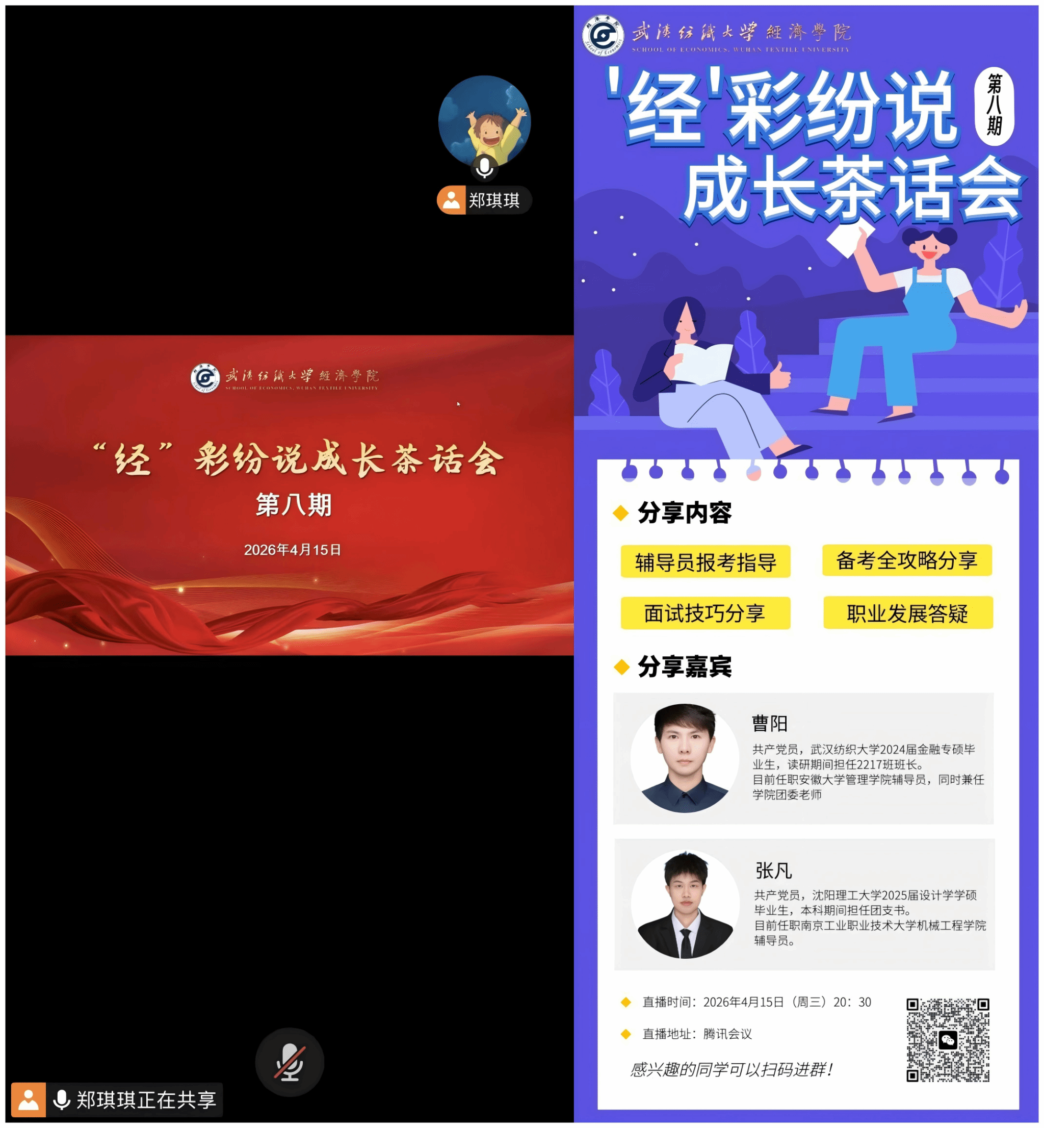 解答研究生在职业规划与就业发展中的困惑与疑问,搭建经验共享、答疑解惑的交流平台,4月15日晚,学院第八期“‘经’彩纷说”成长茶话会通过线上会议形式进行。本次活动由学院研究生会承办,学院2024届硕士毕业生、安徽大学管理学院辅导员曹阳及南京工业职业技术大学机械工程学院辅导员张凡应邀担任访谈交流嘉宾,20余位在校研究生线上参会,大家围绕高校辅导员备考就业与职业发展等内容展开交流。
