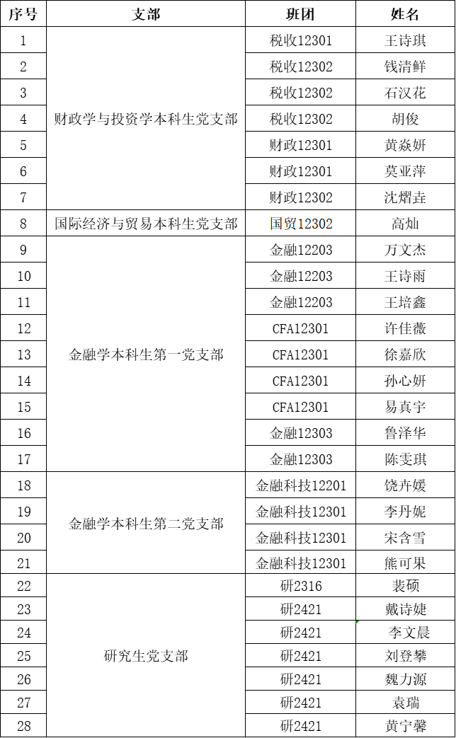 根据《中国共产党章程》和《中国共产党发展党员工作细则》规定,经基层团学组织推荐、资格审查审核、综合考评考察、党支部委员会审议、学院党委审查决定,拟将以下28名学生列为发展对象,现予以公示: