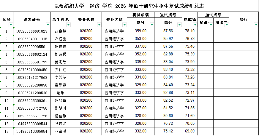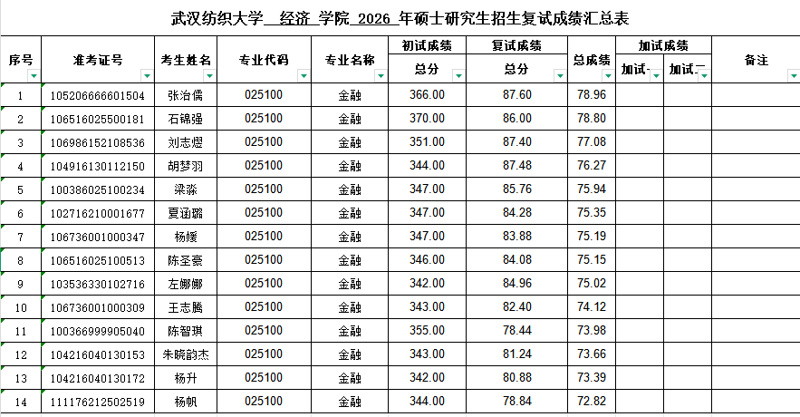 公示时间:2026年4月14日至2025年4月16日。如对公示成绩有异议,在公示期内,可通过书面形式或通过电子邮件向武汉纺织大学经济学院研究生办公室、武汉纺织大学研究生处或学校纪委反映,反映情况应实事求是,以便调查核实。