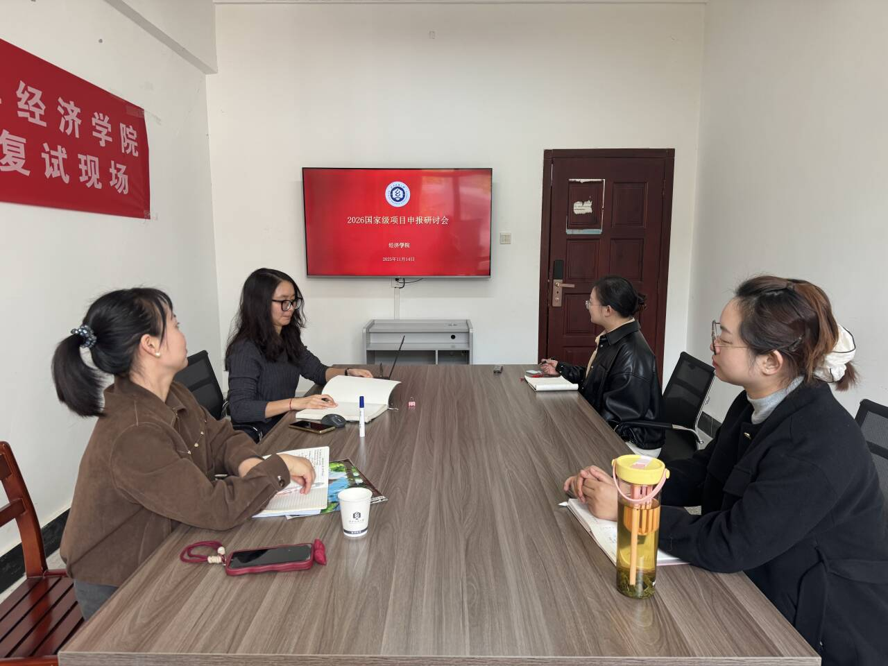 为在2026年国家级科研项目申报中取得新突破,经济学院于2025年11月14日下午2点组织召开2026年国家级项目申报研讨会,正式启动新一轮申报组织工作。会议特邀石小霞老师与李文静老师担任点评嘉宾,王文佳博士与张妍博士作为汇报人参与研讨。
