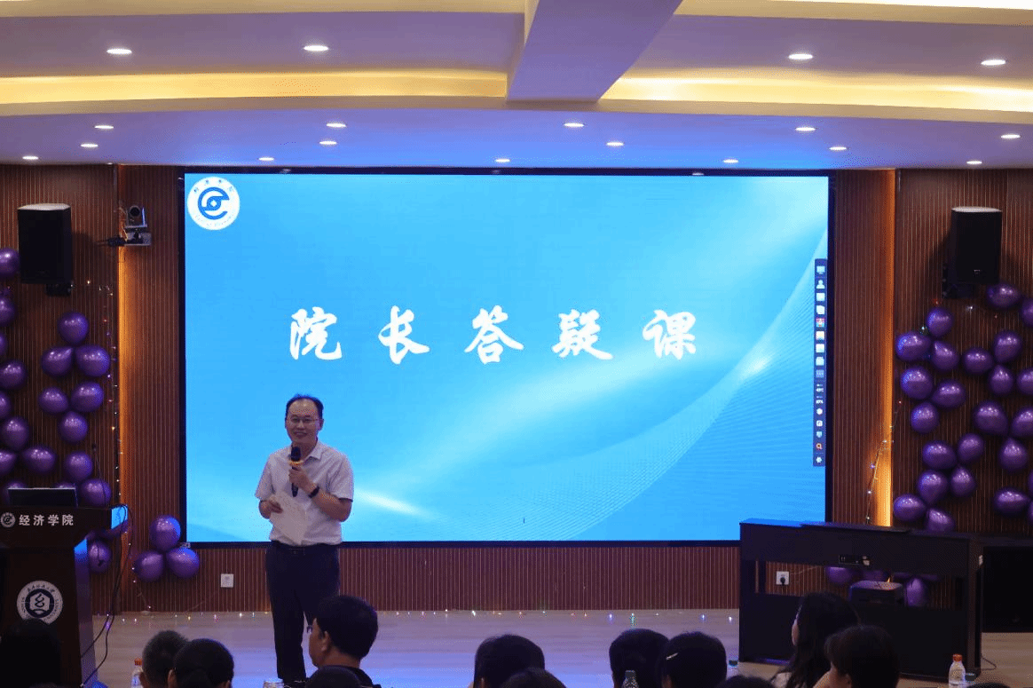 段丁强为同学们介绍了学院的基本情况及发展,让学生更加深入的了解到各专业的发展历史,他鼓励同学们争做有理想敢奋斗的时代接班人,共同推进学科建设。段丁强指出,在四年的专业课学习中,同学们要专心,要有恒心,要细心,要懂专业、爱专业,先要对专业产生兴趣,再树立一个明确的目标,然后运用专业思维和专业知识脚踏实地的奋斗。在此提问环节,不少学生表示对于经济发展前景、科学技术对经济这一学科的影响还存在迷茫,段丁强针对上述问题做了详细解答和指导,他鼓励学生们紧跟时局变化做出努力,为未来打好基础。